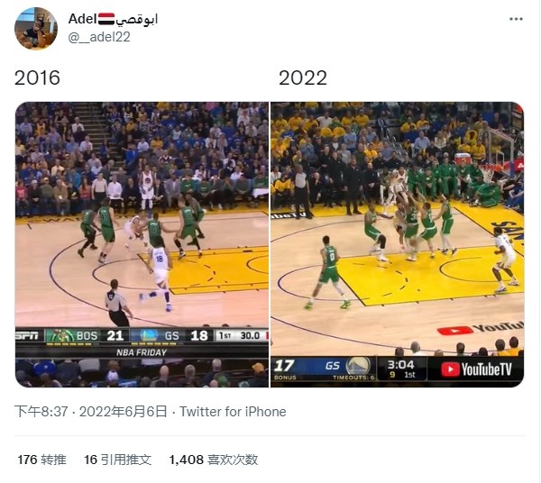 美球迷今日则是趣味对比了库里对阵绿军遭遇的防守待遇,球迷在推特晒出了两张图。