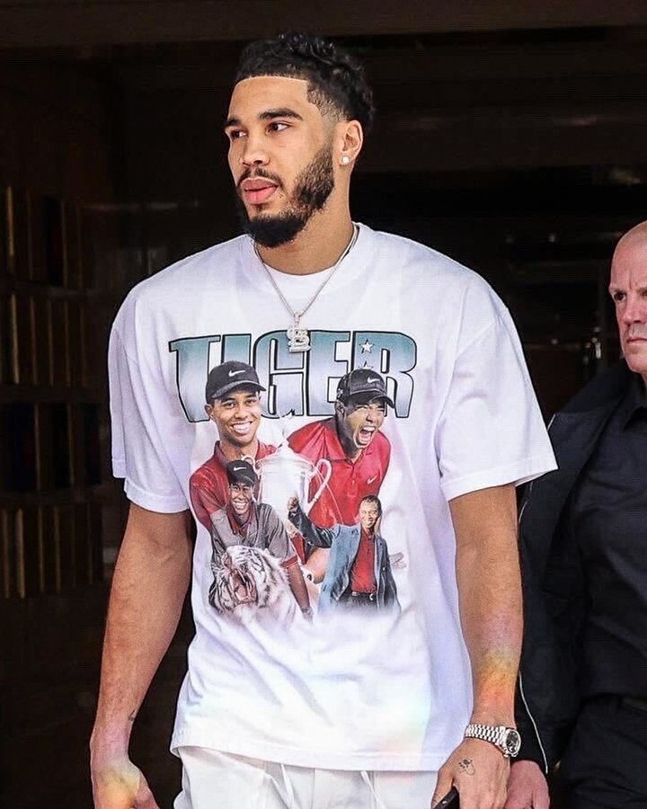 赛前,美媒ESPN晒出了塔图姆进场的T恤,T恤上印着著名高尔夫球手“老虎”泰格-伍兹。