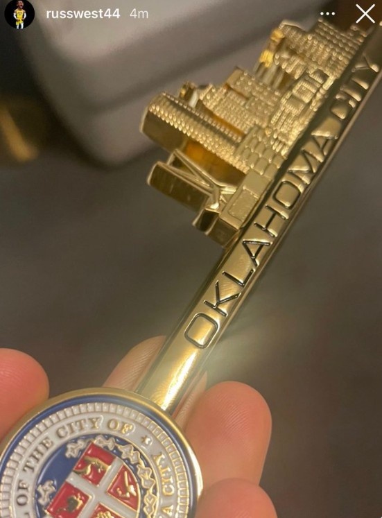 在剪彩仪式上,俄城市长给了威少一把城市钥匙,并且告诉威少他有资格代表雷霆发言,威少随后更新Ins晒出了这把钥匙。