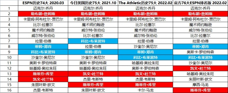2020年3月,ESPN评选的历史74大球员,库里排名第13;2021年10月,今日美国评选的历史75大球员,库里排名第15;2022年2月,The Athletic评选的历史75大球员,库里排名第15;ESPN也在该月为官方的历史76大球星排序,其中库里排名第16。