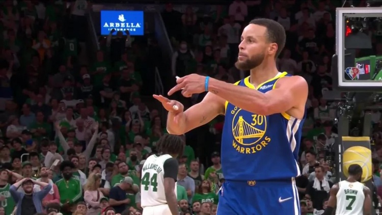 但库里一个接一个打回来。实际上第三节中段,当库里连中两个三分球时,已经在朝场边比划右手了: