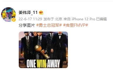 赛后,吉林男篮球员姜伟泽发博晒图祝贺勇士夺冠。