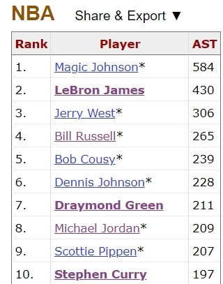 这样一来,库里生涯总决赛助攻次数达到202,成为NBA历史第10位总决赛助攻次数突破200的球员。