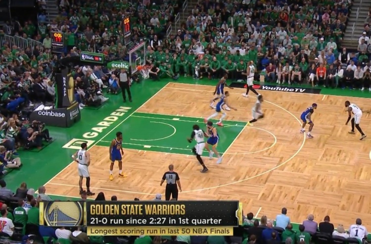 6月17日讯 今日NBA总决赛G6,勇士在第一节末段和第二节初段轰出了一波21-0。