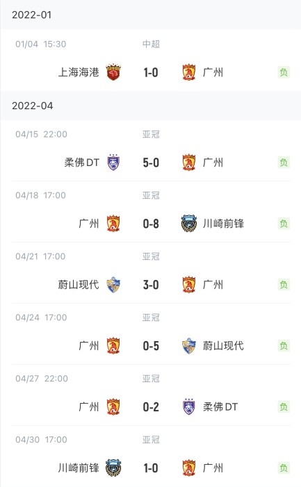 亚冠:柔佛5-0广州、广州0-8川崎前锋、蔚山现代3-0广州、广州0-5蔚山现代、广州0-2柔佛、川崎前锋1-0广州