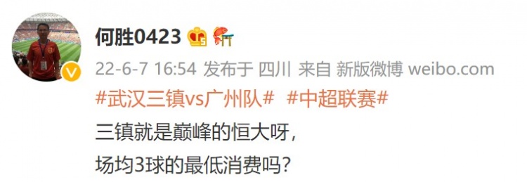 何胜:三镇就是巅峰的恒大呀,场均3球的最低消费吗?