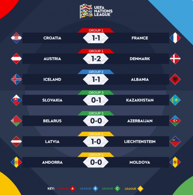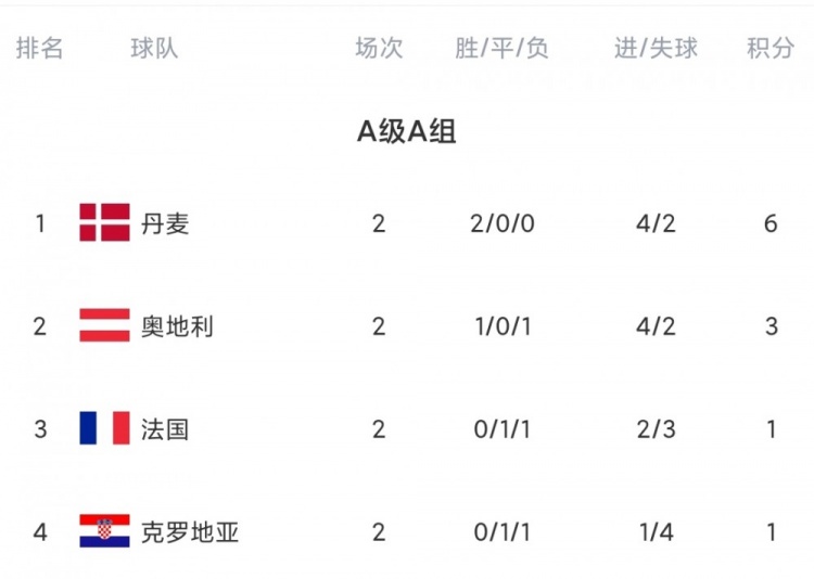 6月7日讯 今日多场欧国联比赛战罢。法国客场1比1战平克罗地亚,奥地利主场1比2不敌丹麦,冰岛1比1战平阿尔巴尼亚。