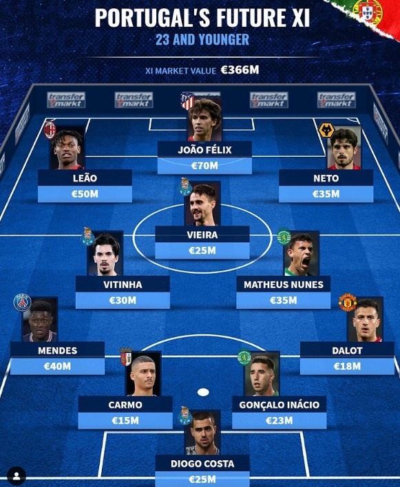 6月7日讯 葡萄牙近年才俊辈出,《转会市场》也列出了一套葡萄牙U23阵容,总身价达到了3.66亿欧元。