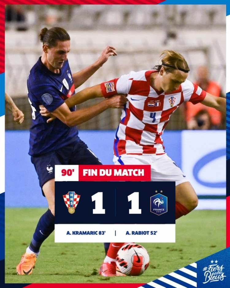 欧国联A级别第2轮,克罗地亚主场迎战法国,拉比奥特单刀破门,克拉马里奇造点随后主罚命中,最终法国客场1-1克罗地亚。