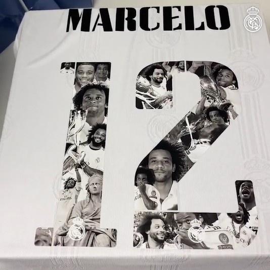 一件专门为马塞洛打造的球衣也印出,在12号的数字中,印满了马塞洛在皇马的荣耀时刻。