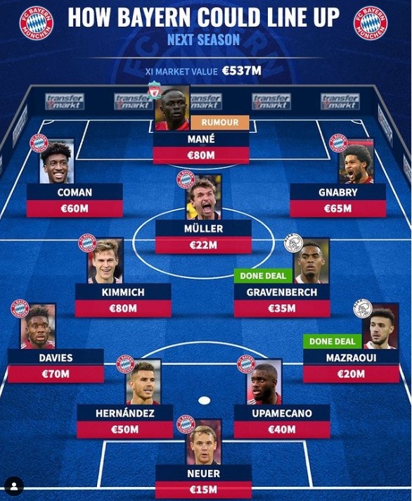 6月14日讯 拜仁在不久前官宣签下格拉文贝赫,《转会市场》则据此预测了拜仁新赛季首发,马内顶替想去巴萨的莱万,阿贾克斯双星在列。
