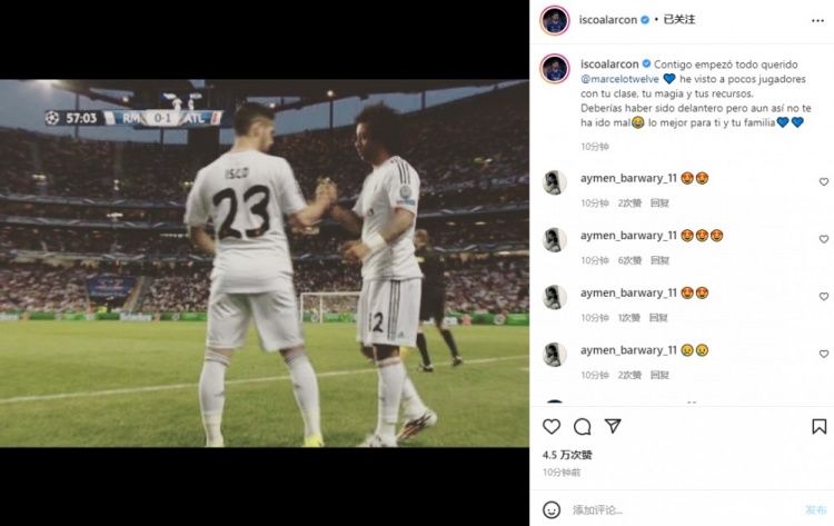 皇马中场伊斯科在社交媒体上对马塞洛进行了告别,他写道:“亲爱的马塞洛,一切都因你而起!我没有见过几名球员能够有你那样的气度、魔力和技能。你本应去踢前锋,但你的收获依然不错。祝你和你的家人一切好运!”