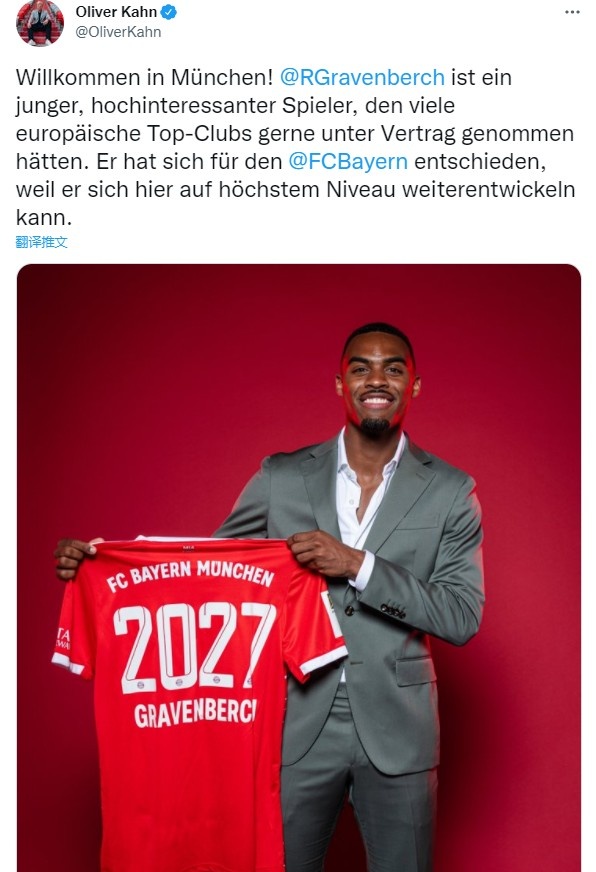 在社交媒体上,卡恩写道:“欢迎来到慕尼黑!格拉文贝赫是一名年轻,令人感到非常兴奋的球员,很多欧洲顶级俱乐部都想要签下他。他选择了拜仁,之所以做出这样的决定,那是因为他能够在这里发展都最高水准。”