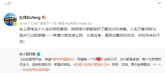 杜锋写道:“站上高考这个人生的特别赛场,我相信大家都做好了最充分的准备。人生万事须自为,跬步江山即寥廓——希望大家轻装上阵,从容应考,展现出最好的状态,你的未来拦不住!”
