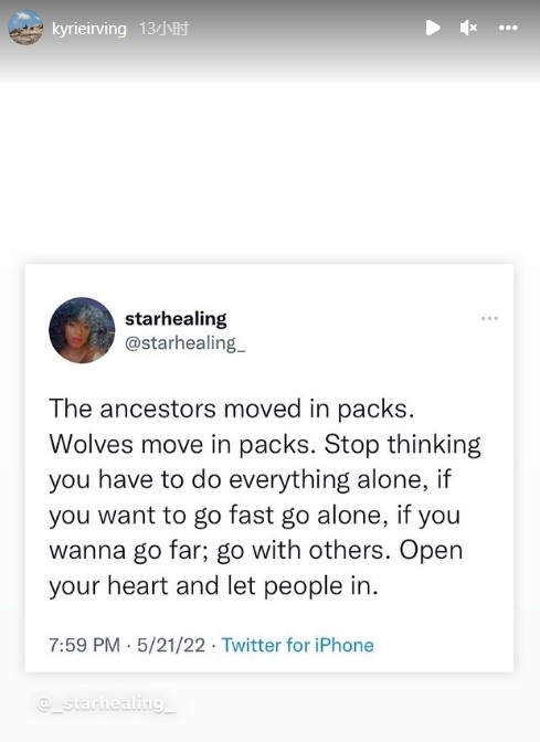 6月7日讯 今日,篮网球星欧文更新社媒转发了一则鸡汤: