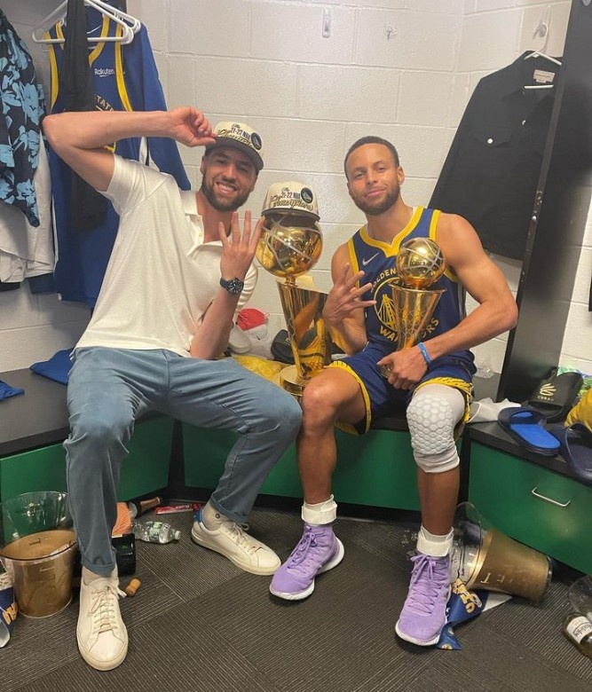 克莱在INS中晒出了自己在更衣室与库里的合照,并且写道:“和这位MVP在一起放松,他们说我们所做的就是投三分,然后赢得冠军!