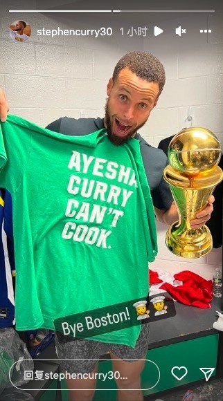 赛后库里更新INS,他晒出一张夺冠后照片。照片中自己手持总决赛MVP奖杯,另一只手拿着一件印有“阿耶莎不会做饭”字样的T恤,库里配文:“再见,波士顿!”
