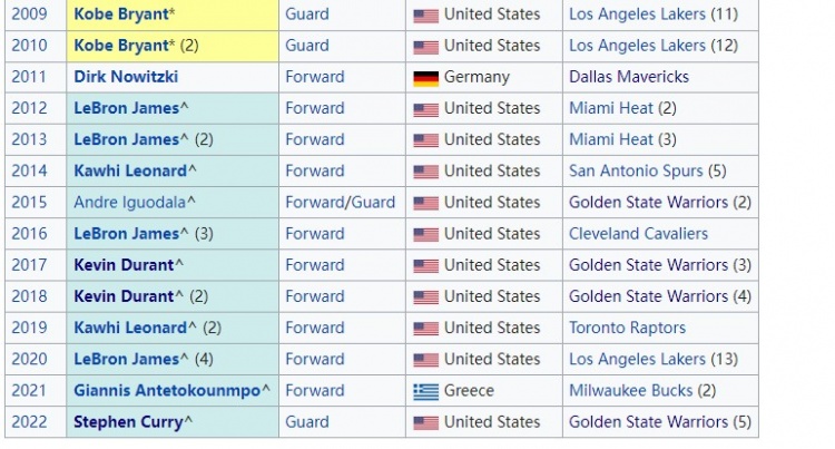 库里成为近12年来首个后卫FMVP,上一位还是2010年的科比。从2011年到2021年,FMVP都被锋线球员包揽。