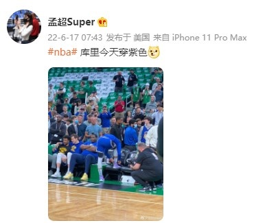 赛前,记者孟超发博晒出一张现场照,并写道:“库里今天穿紫色。”