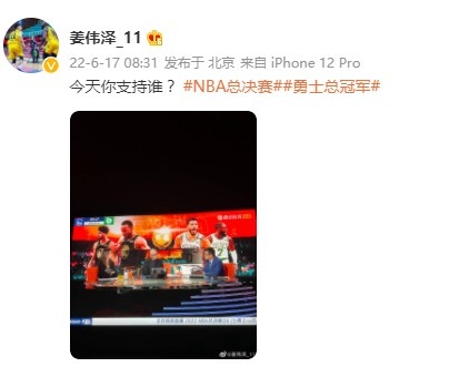 吉林男篮球员姜伟泽发博写道:“今天你支持谁?”