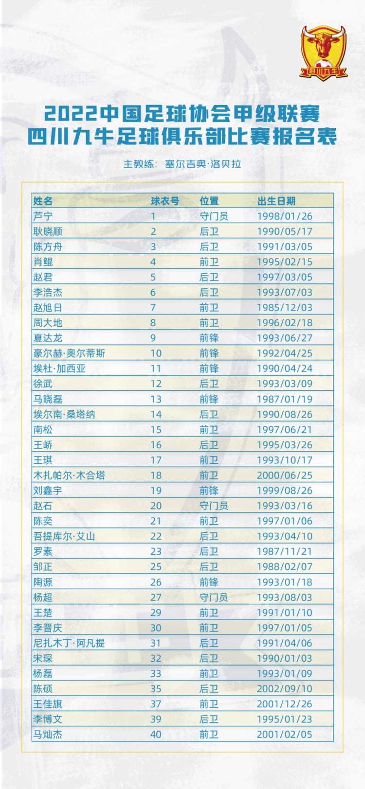 6月7日讯 2022赛季中甲联赛即将开启,四川九牛俱乐部公布了新赛季一线队35人大名单,奥尔蒂斯、加西亚、桑塔纳3名外援领衔,赵旭日、邹正在列。中甲联赛第一阶段,四川九牛将前往大连赛区征战,同组对手包括上海嘉定汇龙、黑龙江冰城、北京北体大、辽宁沈阳城市、新疆天山雪豹。