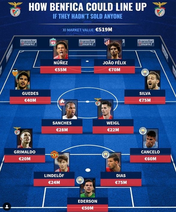 6月14日讯 本菲卡在不久前官宣努涅斯转会利物浦,《转会市场》也列出了一套“本菲卡如果没有卖人”的当前最贵阵容。